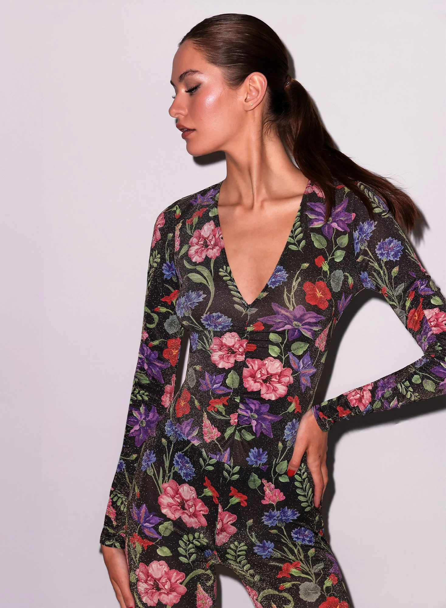 Our Wildfleur Plunge Bodysuit, featuring metallic silk jersey with deep plunge neckline. Thong cut back, bottom snap closure. Complete the look with the matching Wildfleur Stirrup Legging. Materials & Care - Body: 65% Polyamide, 24% PLME, & 11% Elastane - Gusset: 100% Cotton - Dry clean only - SKU: BS0500-1078 Size & Fit - Model is wearing a size Small.
