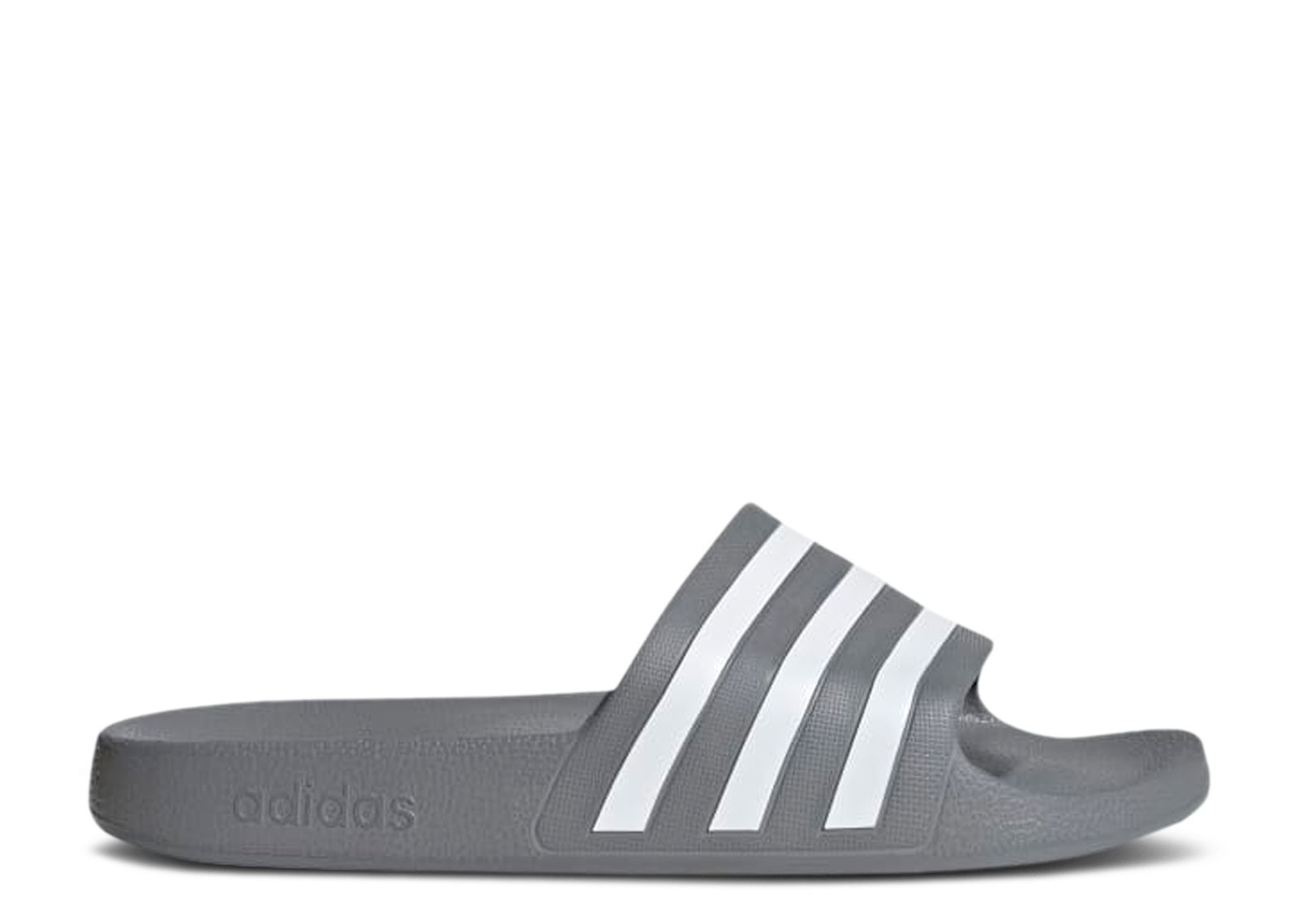 Made to be worn after taking a dip at the pool or the beach, the adidas Adilette Aqua Slide ‘Grey’ rocks white three-stripes for contrast. A quick-drying Cloudfoam footbed is molded to cradle your feet. A lightweight foam midsole gets an embossed adidas wordmark on the sidewall for a final touch. SKU: F35538 Colorway: Grey Three/Cloud White/Grey Three Release Date: 2/20/22