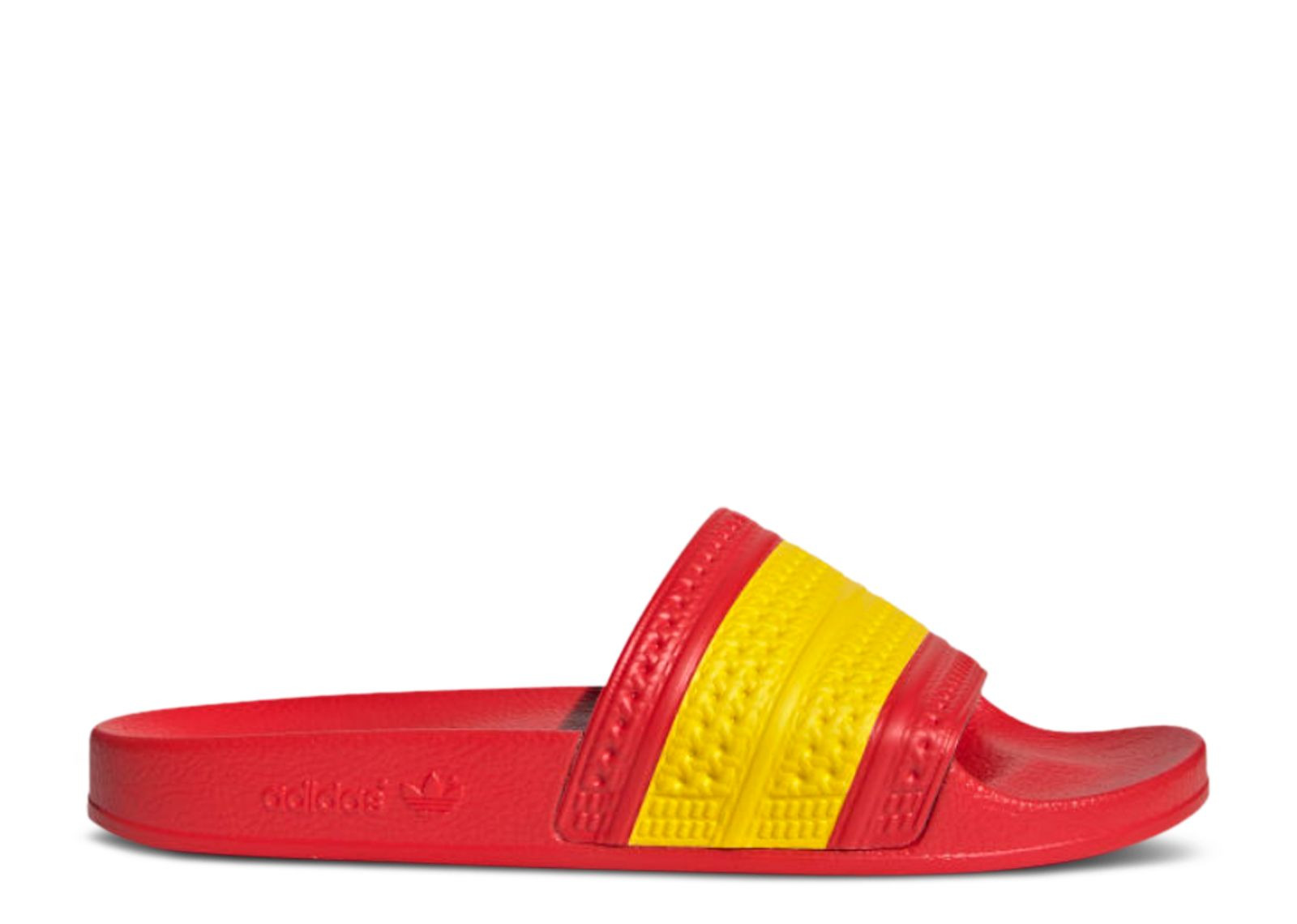 The Adilette Slides 'Spain' emerges with the colors of the Spanish flag on its classic slide construction. Built with polyurethane, the shoe's upper includes a mix of yellow and red, with a quick-drying textile lining supporting the fit. A contoured footbed works with a red foam midsole to anchor the build, giving way to a textured rubber outsole that offers traction. SKU: G55382 Colorway: Red/Yellow/Red Release Date: 7/28/20
