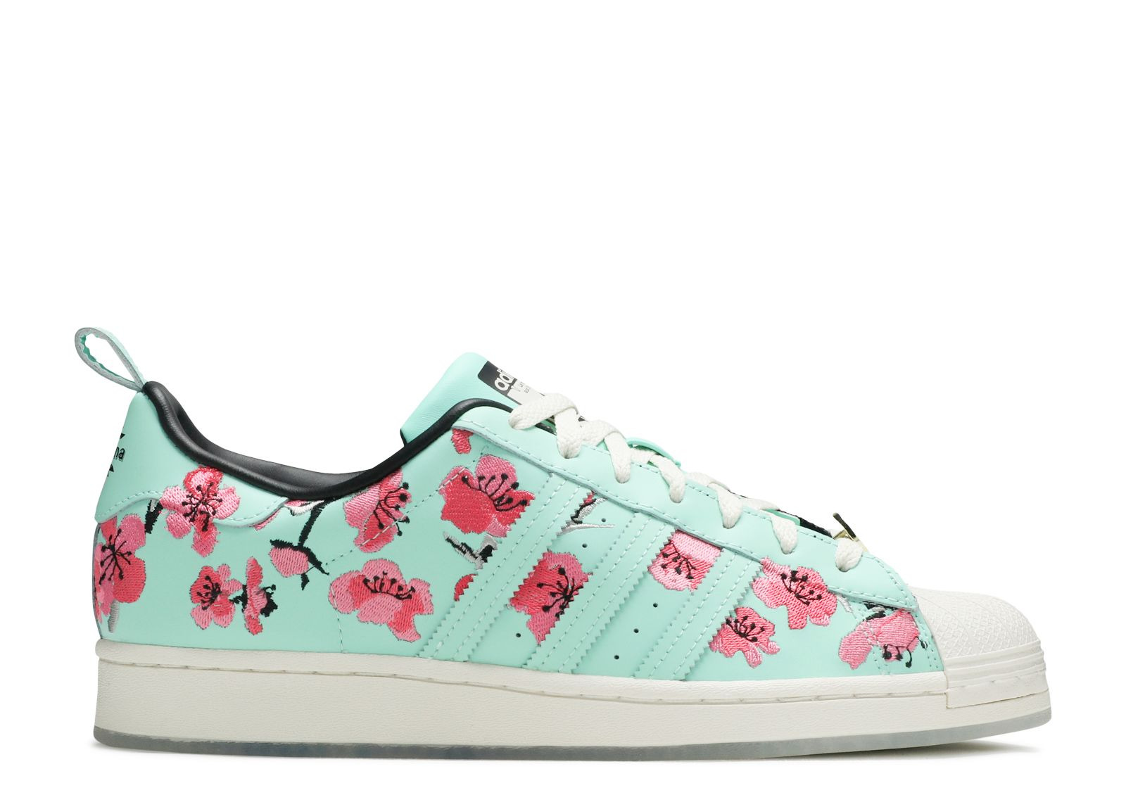 Drawing from the classic Arizona Ice Tea flavor and its signature packaging, the Arizona x Superstar 'Green Tea With Ginseng And Honey' released in collaboration with the drinks brand. Built with leather, the shoe's upper features a teal finish highlighted by pink cherry blossoms throughout. Arizona branding emerges on the heel patch, while 'Have an Iced Day' appears on the smiley face lace deubre. The same tagline appears on the left outsole, with an Arizona logo on the right. SKU: GZ2877 Colorway: Chalk White/Chalk White/Chalk White Release Date: 2/4/21