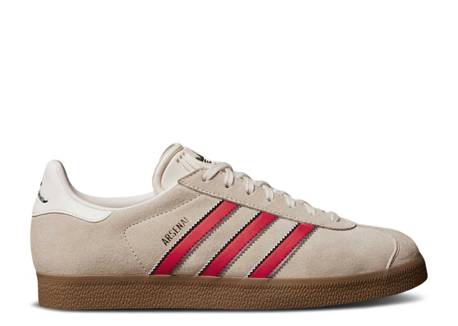 The Arsenal x adidas Gazelle 'Terrace Icons Pack' takes cues from the Gunners' 2024/25 home kit. These shoes have a tan suede upper with red leather three-stripes piped in a metallic gold trim. An embossed Trefoil decorates the molded tongue, while Arsenal's cannon logo embellishes the off-white leather heel tab. A gum rubber sole unit undergirds the design. SKU: JS3042 Colorway: Off White/Better Scarlet/Night Sky Release Date: 1/30/25