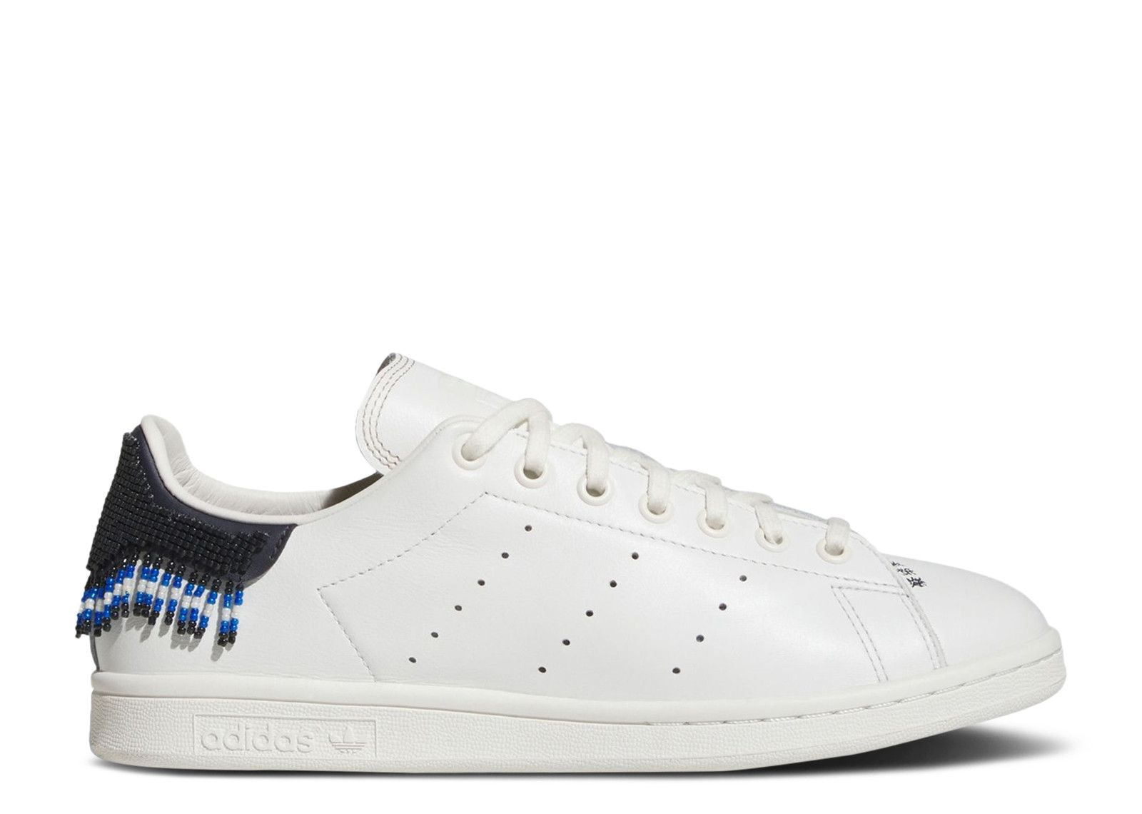 The CLOT x adidas Stan Smith 'Beaded' keeps the classic perforated three-stripes on a clean, white leather upper. The leather back tab is encrusted with beads, using black, royal blue and white hues. A discreet CLOT logo adorns the toe area, while both brand logos grace the insoles. A white rubber sole unit completes the look. SKU: JR0022 Colorway: Core White/Night Navy/Core White Release Date: 7/12/25