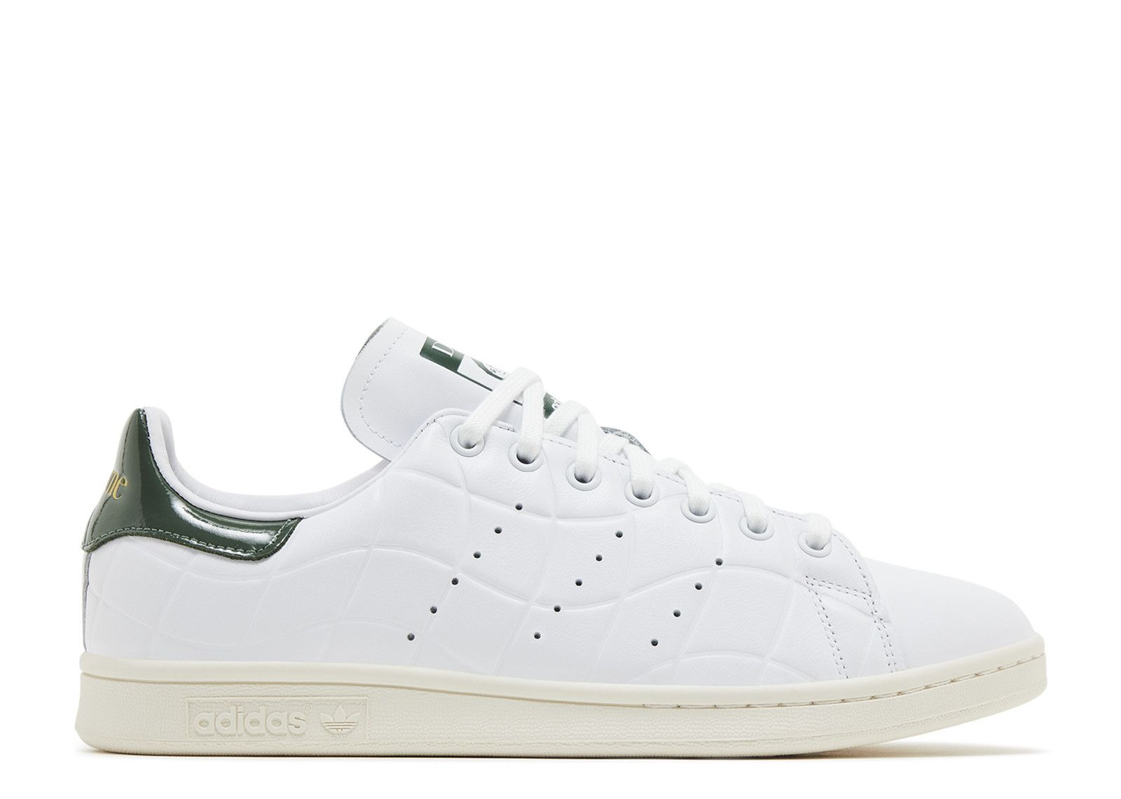 The Dime x adidas Stan Smith 'White Green Oxide' sports a white leather upper, using the Montreal skate brand's signature wavy lines through the side panels. A custom Dime label adorns the tongue, while the Dime logo graces the green patent leather back tab in gold foil letters. A sturdy rubber cupsole is done up in an off-white finish to keep the vintage aesthetic. SKU: IG2044 Colorway: Footwear White/Collegiate Green/Green Oxide Release Date: 7/1/24