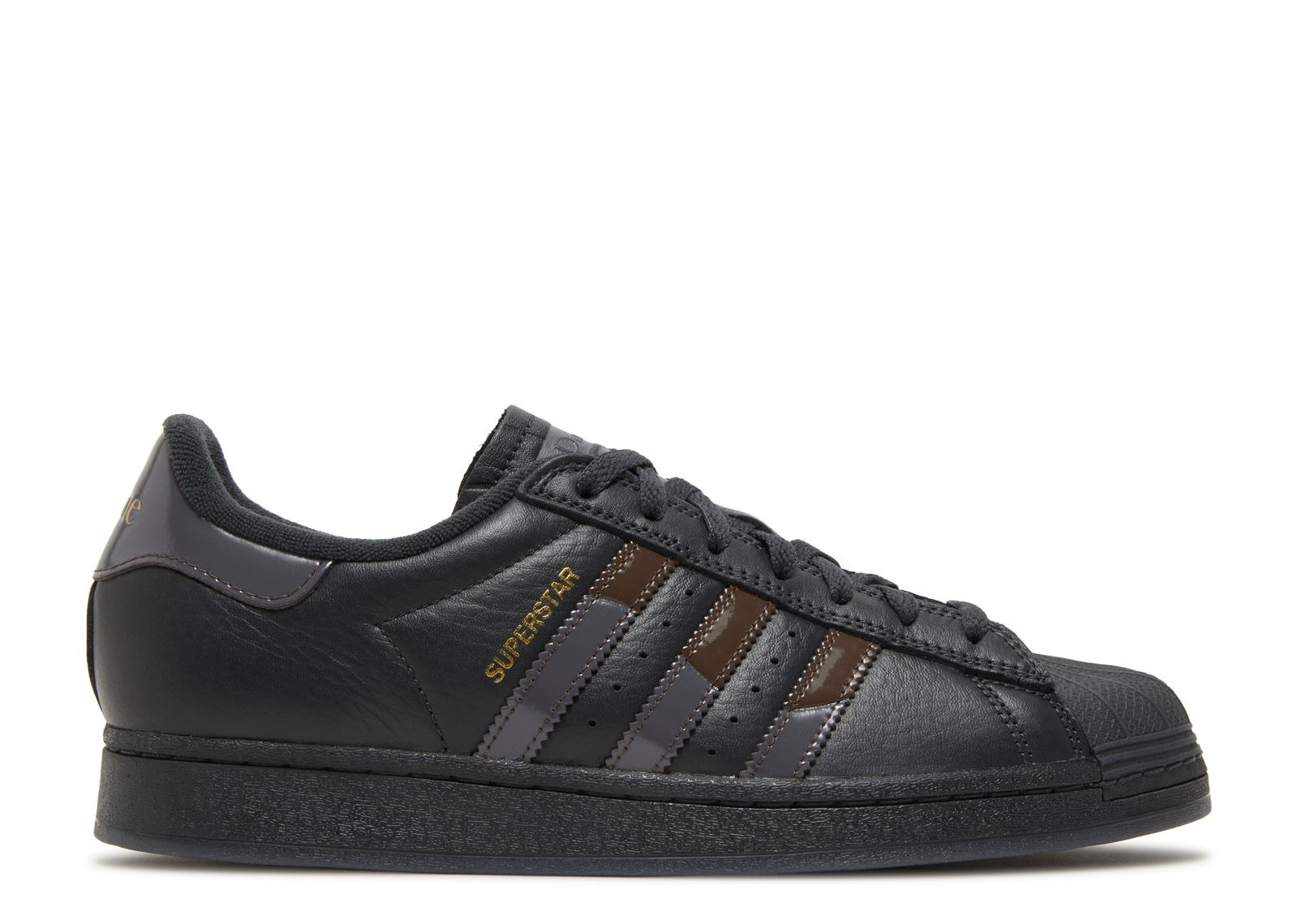 The Dime x adidas Superstar ADV 'Carbon Brown' is part of a special collaborative capsule collection and brings a modern and sleek aesthetic to the iconic silhouette. The signature rubber shell toe maintains its classic appeal in a black finish that matches the upper which arrives in all-black full-grain leather for an understated look. Adding a touch of contrast, the two-tone patent leather is featured on the heel tabs, displaying alternating adidas and Dime branding for a unique twist. The black rubber midsole reveals an oversized Dime logo in metallic gold lettering and provides cushioning and support via its clear herringbone-traction outsole. SKU: FZ6003 Colorway: Carbon/Grey Five/Brown Release Date: 5/15/23