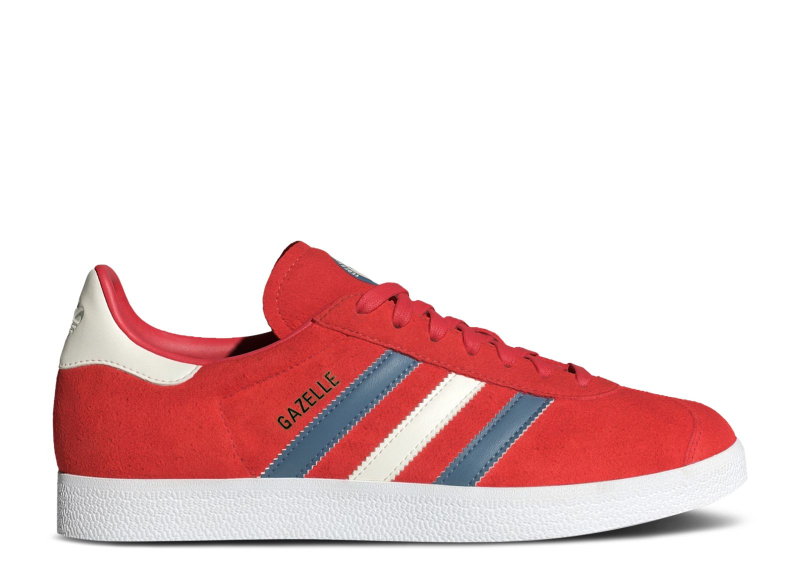 The adidas Gazelle 'Chile' takes part in the 'National Team Retro Collection,' rolling out a scarlet suede upper with serrated leather three-stripes in alternative blue and off-white tones. The model name appears in gold foil next to the three-stripes while the Trefoil logo appears debossed on the leather back tab. The Chilean Football Federation emblem is displayed on the tongue for a dose of national pride. A crisp white rubber outsole wraps up the look in style. SKU: IF6827 Colorway: Glory Red/Altered Blue/Off White Release Date: 12/1/23