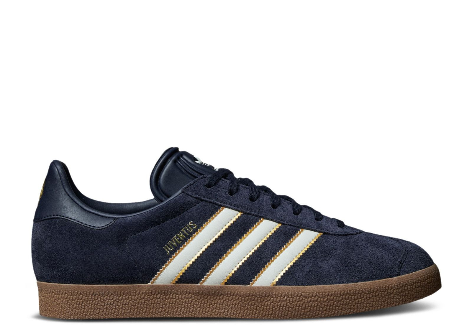 The Juventus FC x adidas Gazelle 'Terrace Icons Pack' celebrates '80s football culture, starting with a navy suede upper and white leather three-stripes trimmed in gold. A 'Juventus' signoff is stamped on the side, while the club's horse logo adorns the back tab. An embossed Trefoil lands on the molded tongue, while a gum rubber sole unit completes the look. SKU: JS3044 Colorway: Legend Ink/Off White/Dark Football Gold Release Date: 1/29/25