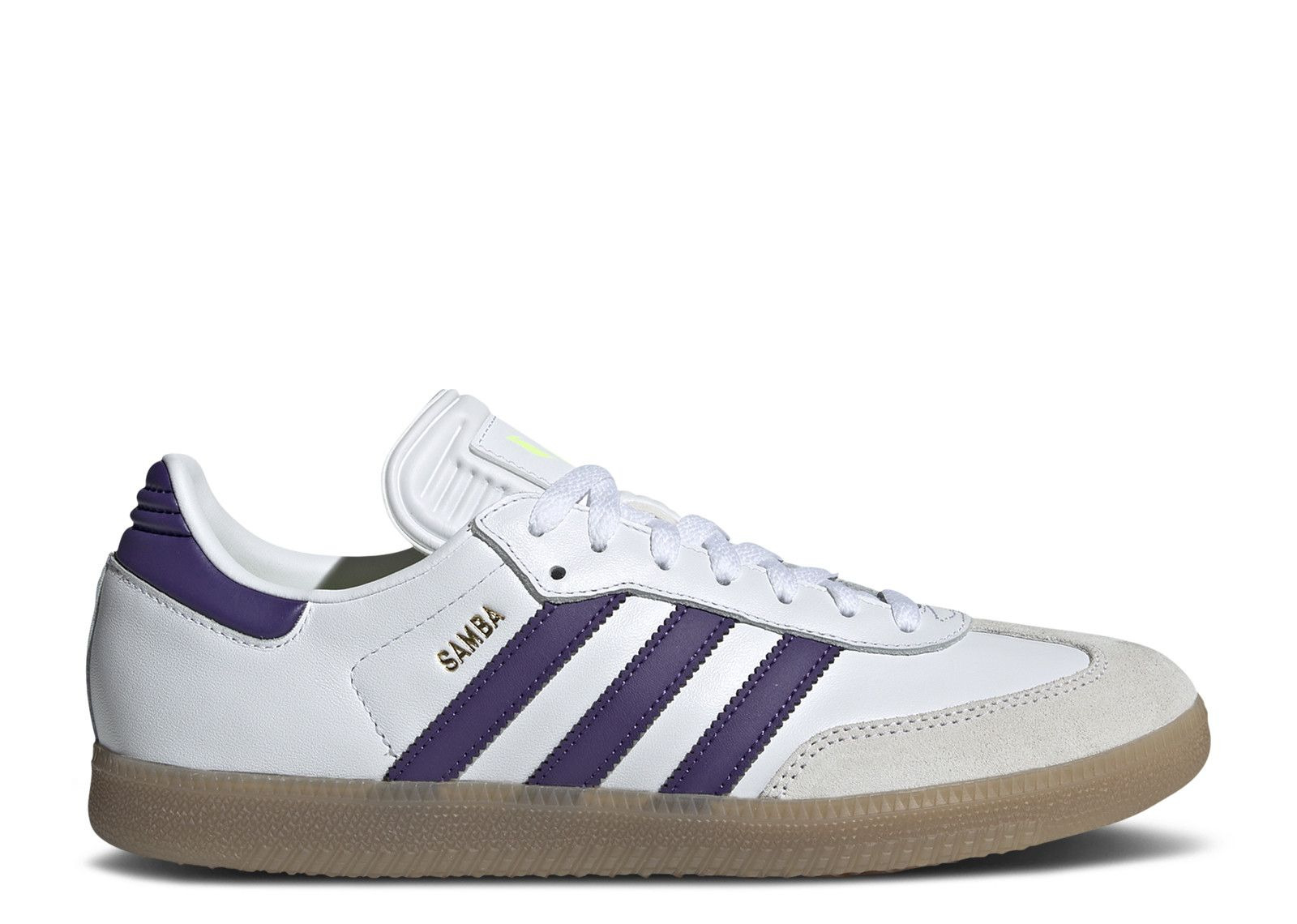 The Lionel Messi x adidas Samba OG 'Unity Purple Pack' has a white leather upper with an off-white, suede T-toe overlay. Vibrant violet pops make their way to the serrated leather three-stripes and the back tab. Neon green insoles match the color of Lionel Messi's logo on the tongue. A goldfoil 'Samba' is stamped right below the three-stripes for a signature look, while a gum rubber sole unit undergirds it all. SKU: IH8161 Colorway: Cloud White/Purple/Gum Release Date: 10/10/24