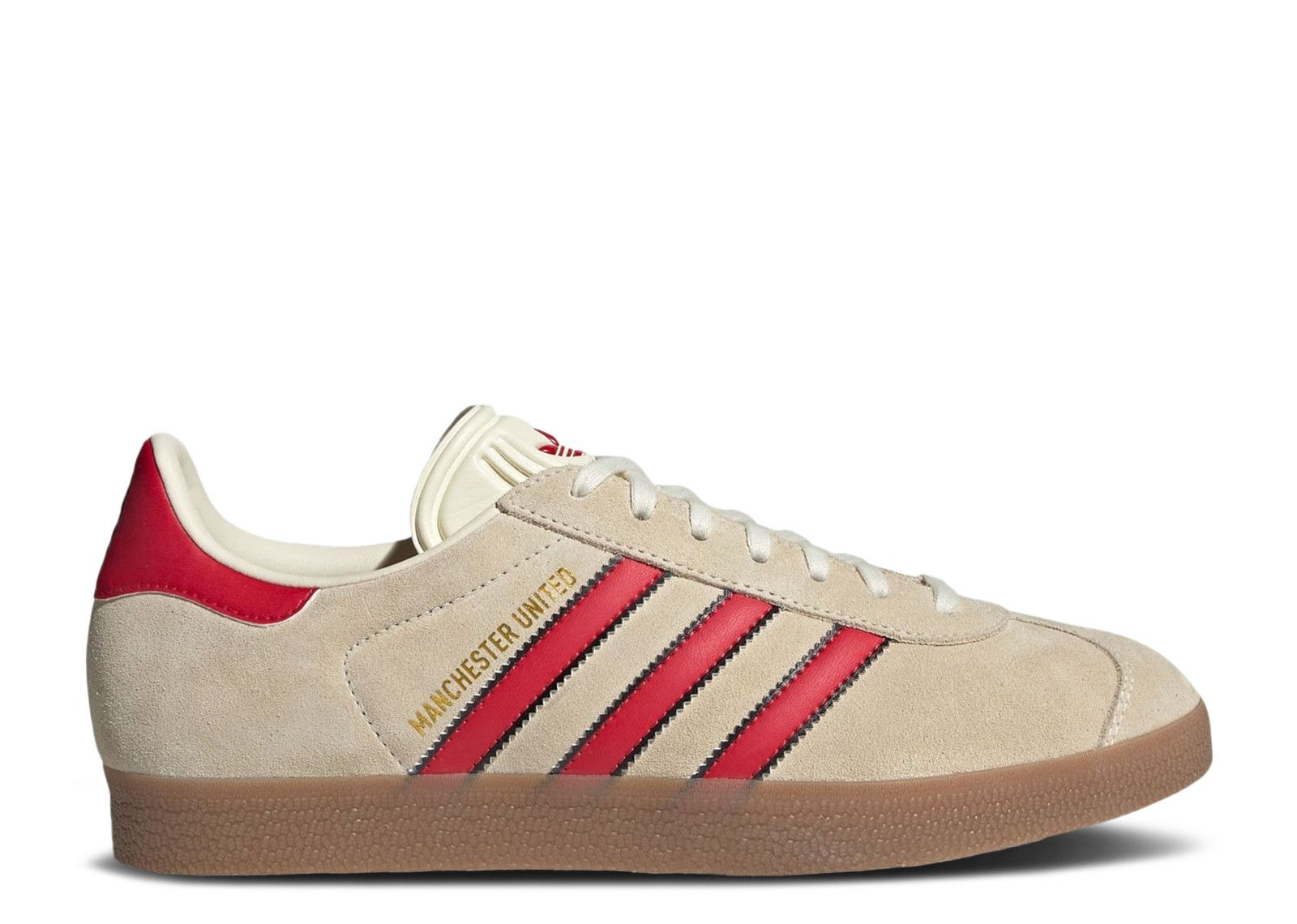 The Manchester United x adidas Gazelle 'Terrace Icons Pack' complements a tan suede upper with red leather three-stripes, piped in a serrated black trim, and a back tab stamped with the Man U logo. A matching red Trefoil adorns the tongue, while 'Manchester United' is stamped in goldfoil letters. A gum rubber sole unit completes the look. SKU: JS3040 Colorway: Cream White/Mufc Red/Core Black Release Date: 2/12/25