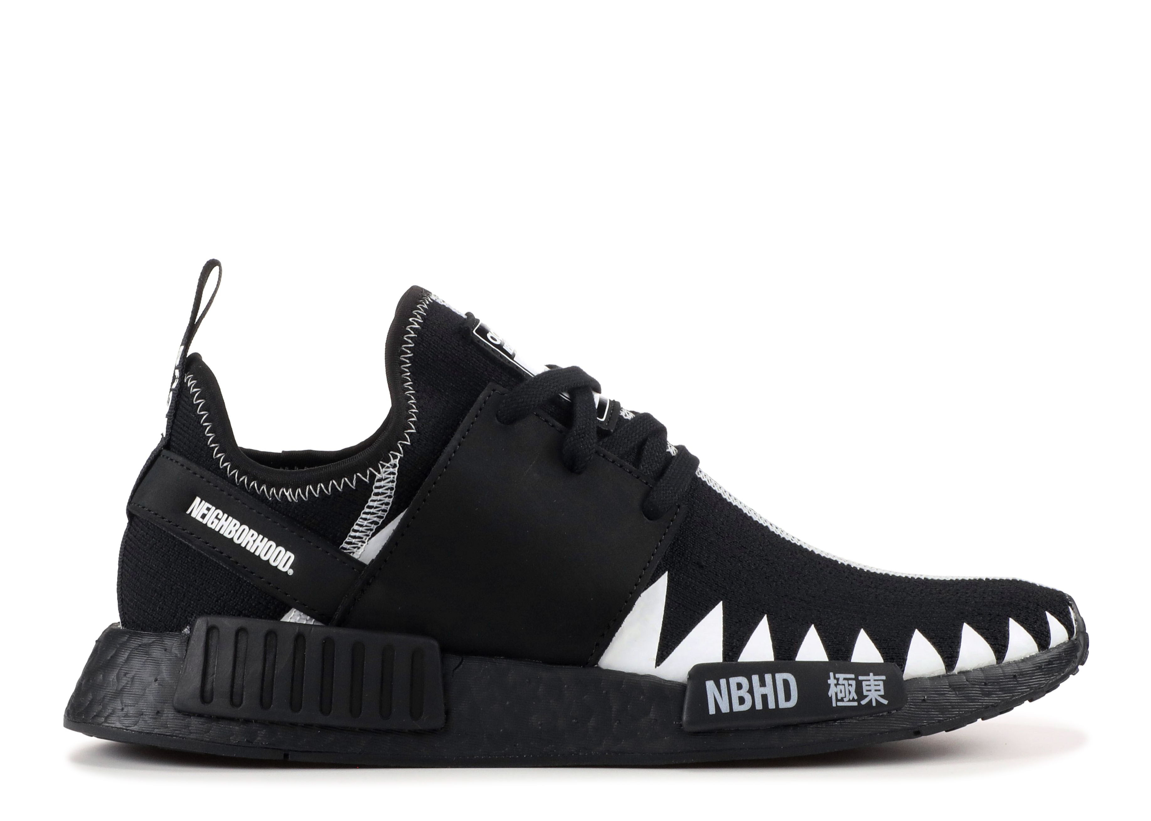 The Neighborhood x NMD_R1 Primeknit is drawn from a 2018 collaboration inspired by Japanese streetwear and motorcycle culture. Those sensibilities are expressed on this NMD_R1 design, featuring a black Primeknit upper with contrast stitching and zigzag detailing inspired by Shinsengumi’s team symbol flag. Neighborhood branding appears on the heel strap, pull loop and EVA plug. SKU: DA8835 Colorway: Black/White Release Date: 2/24/18