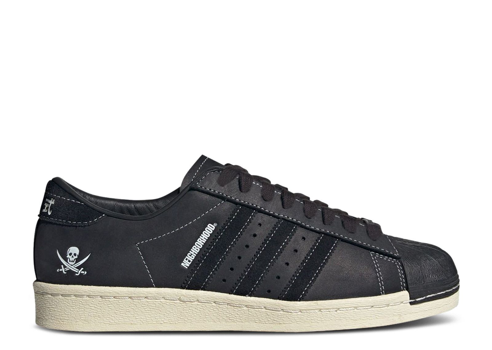 The Neighborhood x adidas Superstar '30th Anniversary' nods to the Japanese's label milestone, reissuing the brands' 2005 collaboration. These sneakers have a black leather upper with matching suede three-stripes complemented by white stitching. 'Neighborhood' is stamped on the side, while the label's skull and swords emblem adorns the side of the heel. SKU: ID8650 Colorway: Core Black/Core Black/Footwear White Release Date: 6/22/24