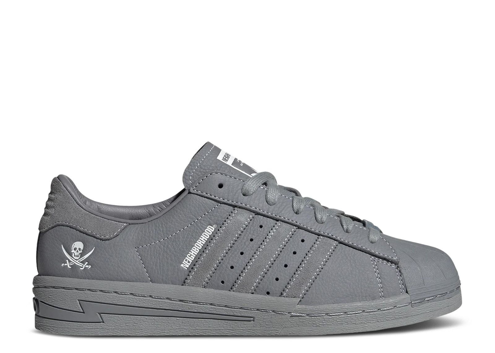 The Neighborhood x adidas Superstar 'Cement Grey' brings a grey tumbled leather upper, complemented with a Neighborhood-branded suede back tab. The Japanese label's skull and swords logo decorates the heel, while its name is stamped on the quarter panel. A grey rubber midsole keeps the colorblocking steady, built with stitched sidewalls and an embossed Tokyo wordmark along the heel. SKU: IE6115 Colorway: Grey/Grey/Cloud White