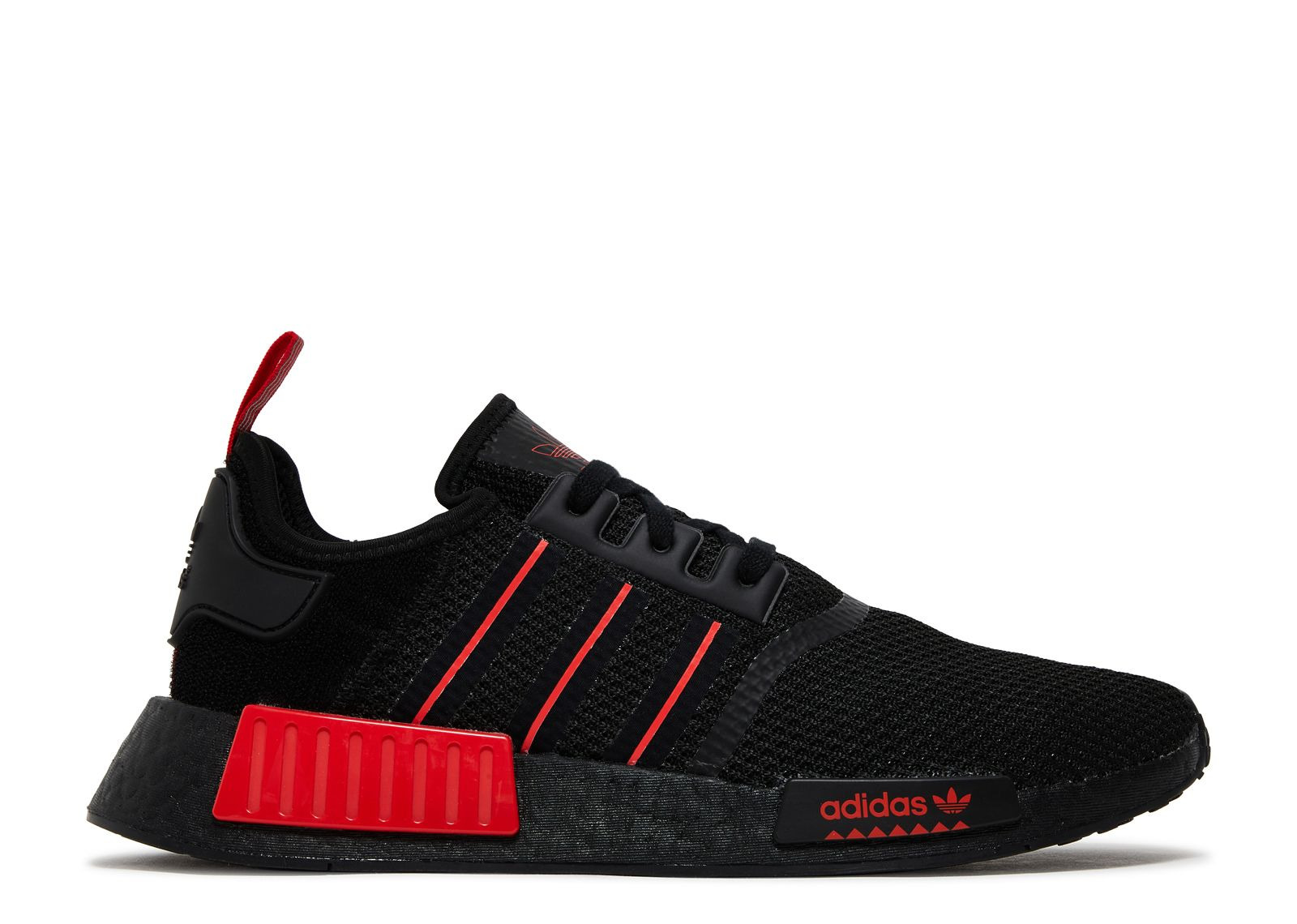 The NMD_R1 'Core Black Red' features a classic contrasting look on its lifestyle construction. Built with knit textile, the shoe's upper appears in black, contrasted by red on the Three-Stripes, tongue tag and heel pull-loop. The Velcro heel overlay offers customizability via interchangeable patches, while underfoot, a full-length Boost midsole provides cushioning, supported by two-tone EVA plugs for stability. A black rubber outsole is included for traction. SKU: GV8422 Colorway: Core Black/Core Black/Red Release Date: 8/23/21