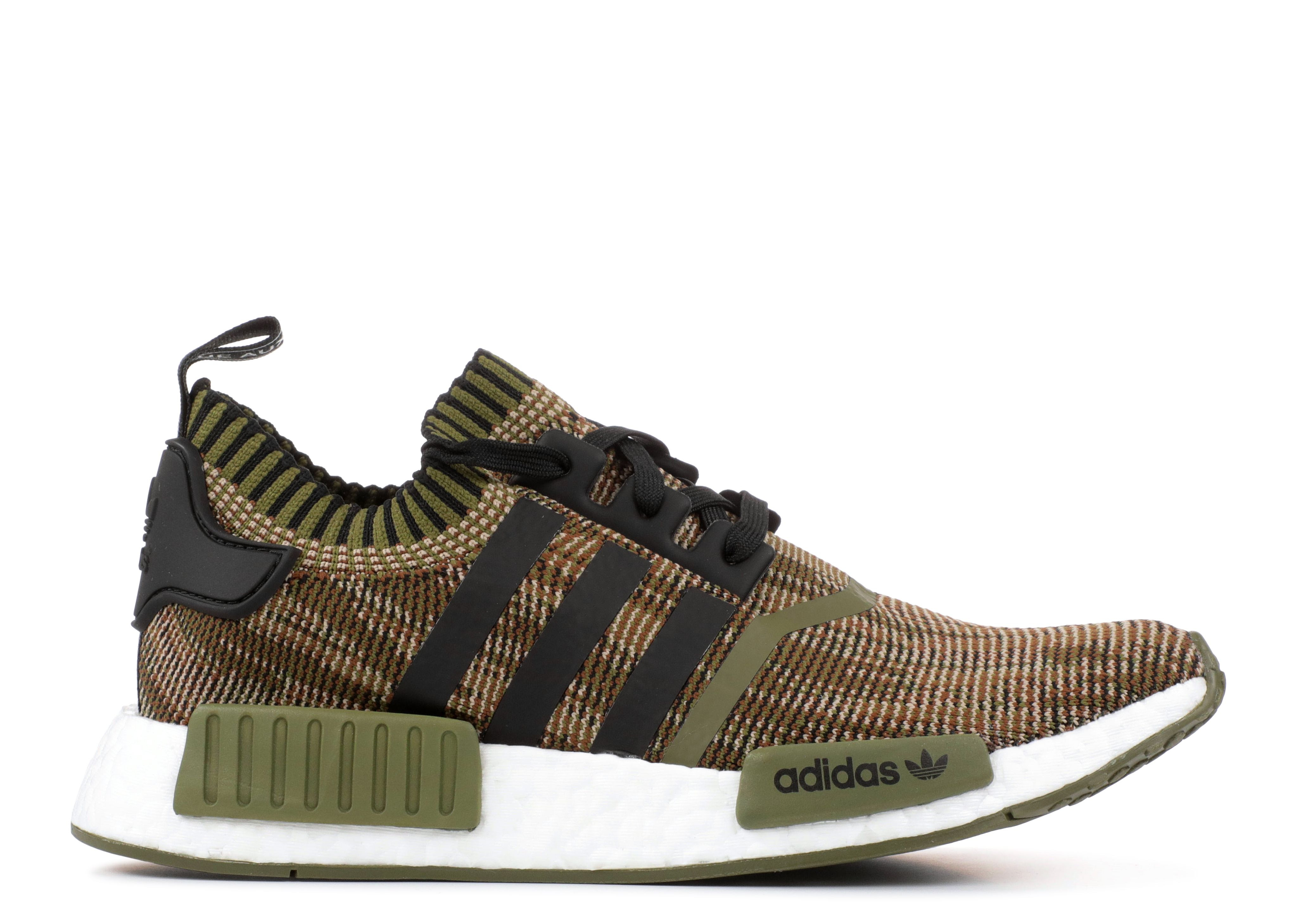 The NMD_R1 Primeknit 'AI Camo Pack' features a digi camo pattern throughout its Primeknit upper, finished in a series of brown hues. The Three-Stripes, eyestay and heel patch contrast the look in black, while Olive Cargo emerges on the sock-like collar, forefoot overlay and EVA plugs. A white Boost midsole provides cushioning, with more Olive Cargo on the outsole. SKU: CQ1864 Colorway: Olive Cargo/Core Black/Core Black Release Date: 10/20/17