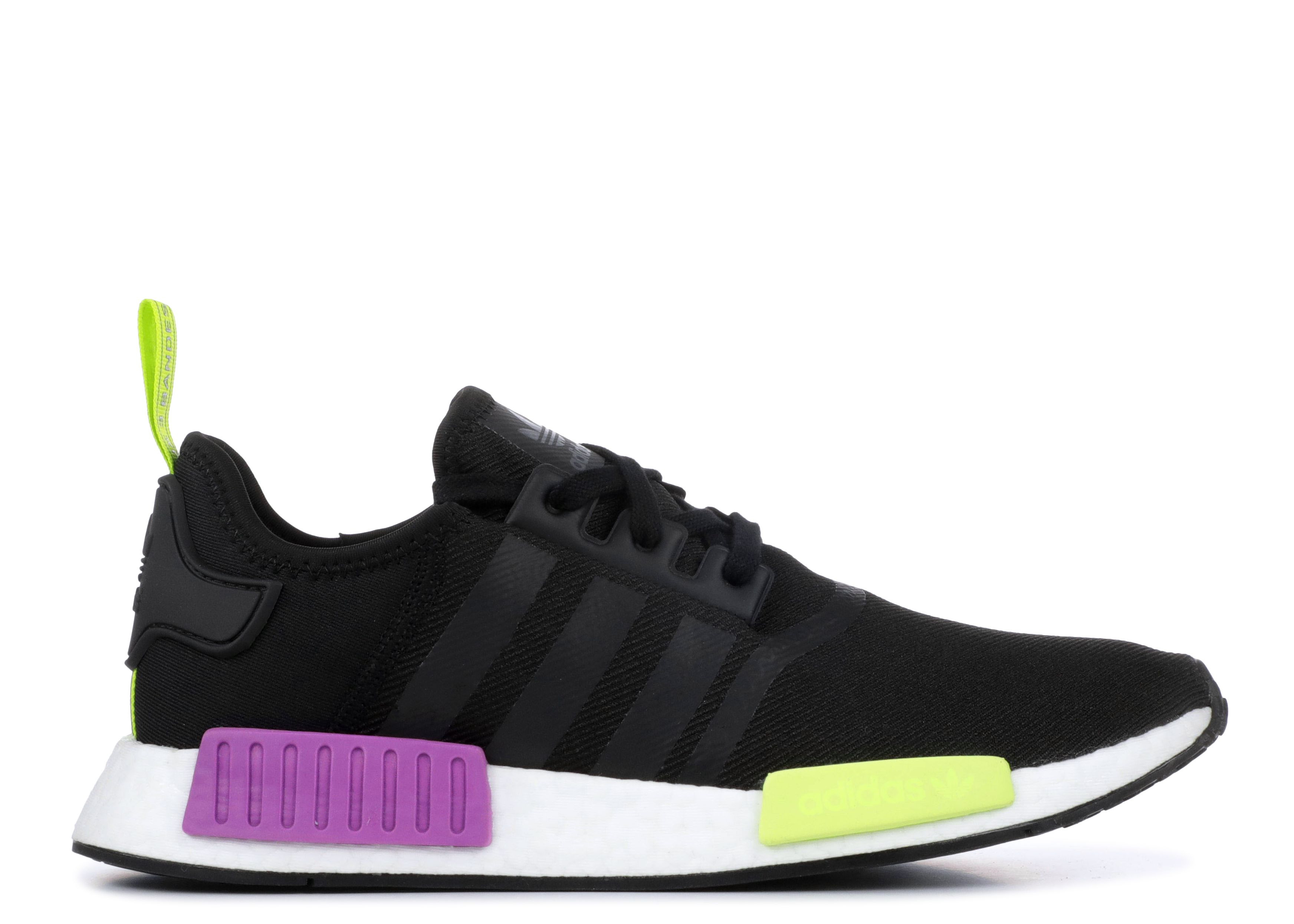 The NMD_R1 'Shock Purple' combines a black upper with vibrant tooling. The shoe's knit upper emerges with a tonal look, save for a bright yellow hit on the heel pull-loop and medial-side branding. A white Boost midsole includes Shock purple and bright yellow on the EVA plugs, giving way to a black outsole. SKU: D96627 Colorway: Core Black/Shock Purple/Semi Solar Yellow Release Date: 8/1/18