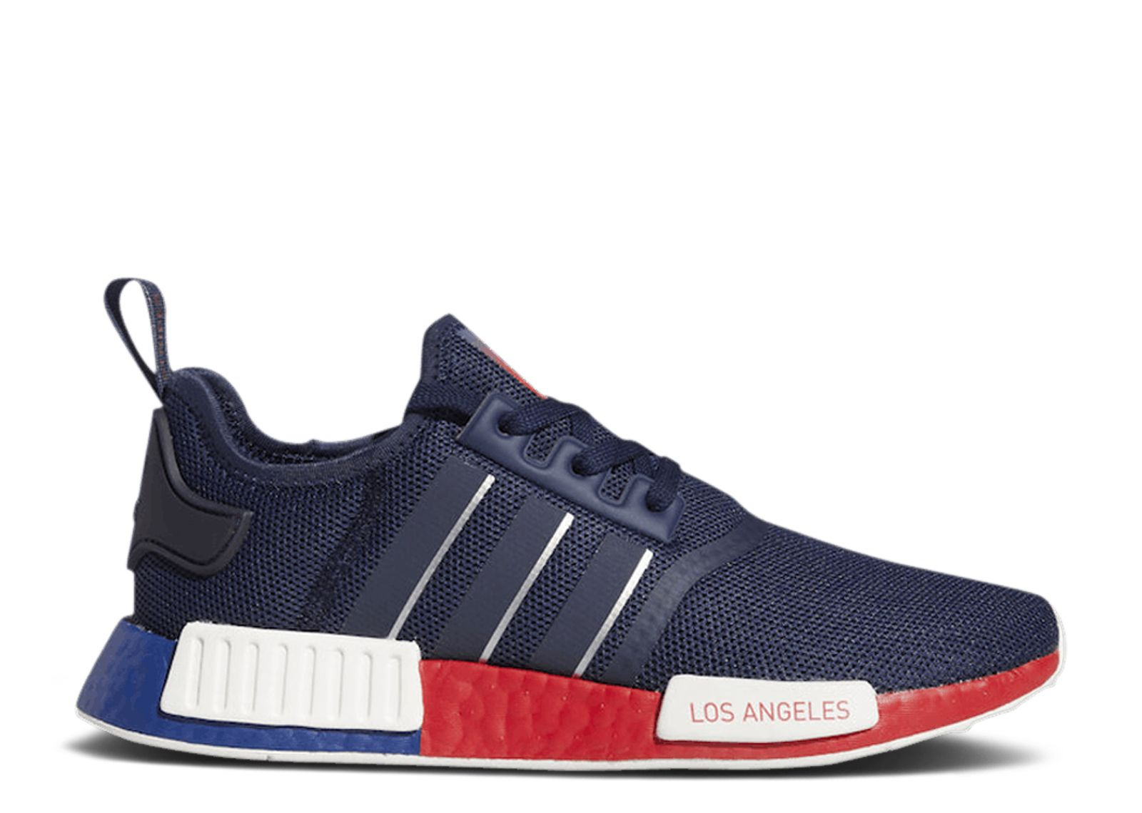 The NMD_R1 'United By Sneakers - Los Angeles' released as part of the United by Sneakers collection. Giving the nod to Los Angeles, which hosted the 1984 Summer Olympics, the shoe's knit upper is finished in a patriotic mix of red, white and blue. A similiar finish marks the Boost midsole, while the forefoot EVA plug sports 'Los Angeles.' SKU: FY1162 Colorway: Collegiate Navy/Silver Metallic/Scarlet Release Date: 5/29/20
