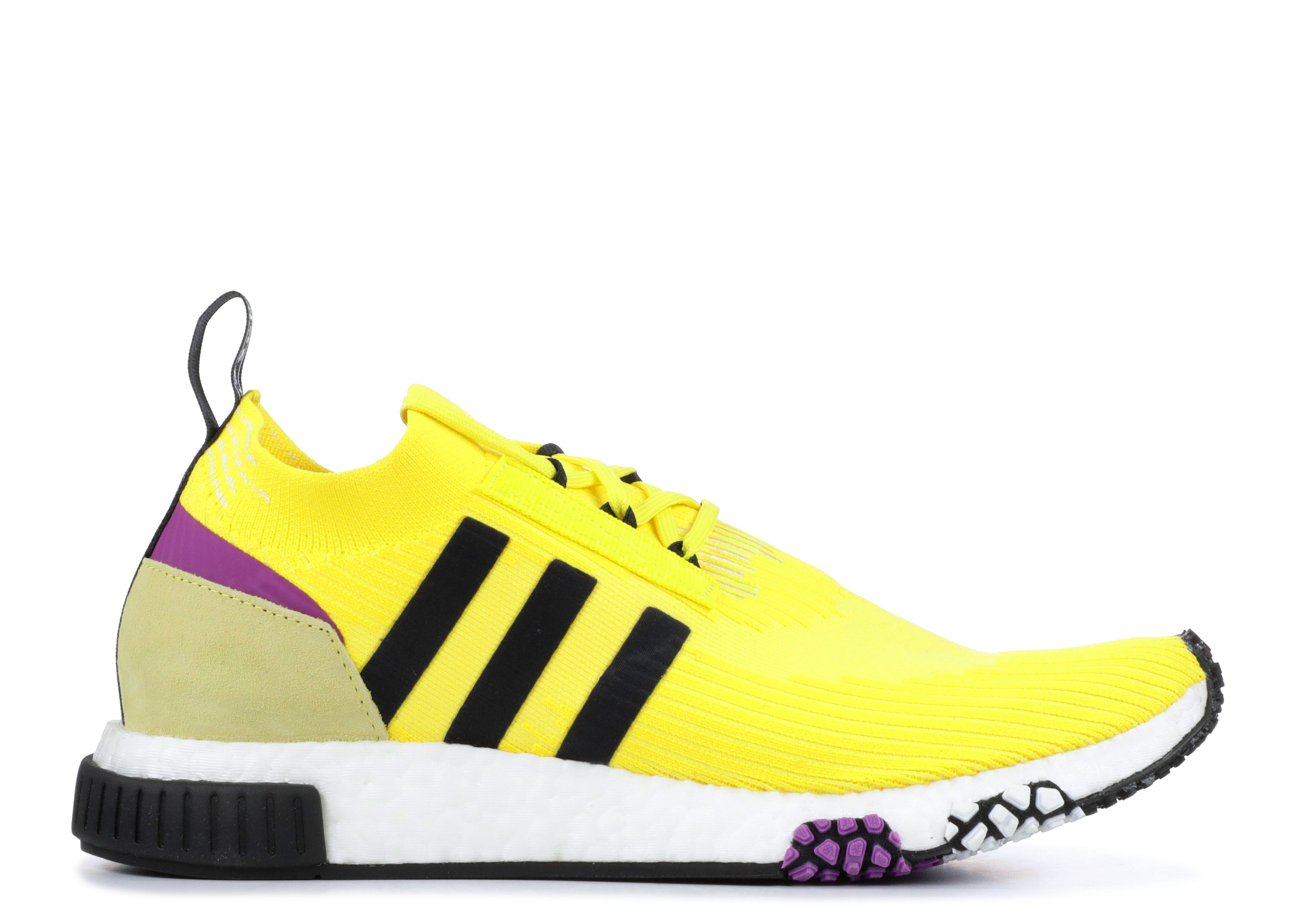 The adidas NMD_Racer PK 'Lakers' sneaker, launched in August 2018, is an unofficial tribute to the Los Angeles team. Its 'Solar Yellow' Primeknit bootie boasts contrast Three-Stripes at the sides, looped eyelets, and a branded pull tab. Bursts of purple appear on the heel above a suede cup. Its cushioning Boost midsole features forefoot plugs and coffers protection via a toe bumper and durable rubber outsole. SKU: B37641 Colorway: solar yellow/core black/shock purple Release Date: 9/30/18