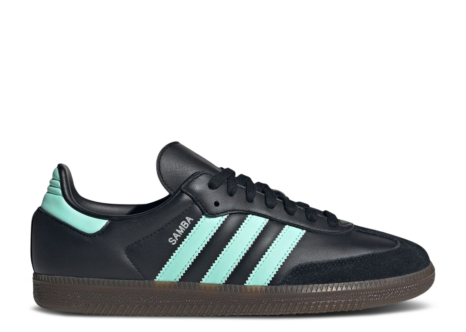 The adidas Samba OG 'Clear Mint Pack' rocks a black leather upper with matching suede on the T-toe overlay. Mint-colored pops reign the back tab and serrated three-stripes, while a 'Samba' signoff nods to the OG line. The Trefoil logo is visible on the leather tongue, all topped off with a gum rubber sole unit underfoot. SKU: JR7109 Colorway: Core Black/Clear Mint/Gum Release Date: 1/9/25