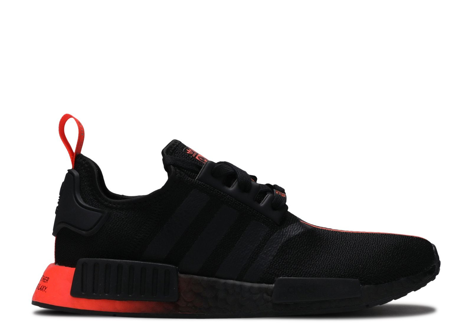 A December 2019 arrival, the Star Wars x adidas NMD_R1 'Darth Vader' from the 'Characters' pack nods to the final episode of the legendary film franchise. The shoe's mesh upper, Three-Stripes, and taping are swathed in black to symbolize the dark side of the Force. Red components stand in for the Sith Lord's lightsaber and his image emerges on the tongue. 'Join Me and Together We Can Rule the Galaxy' is inscribed across the gradient-hued Boost midsole. SKU: FW2282 Colorway: Core Black/Core Black/Solar Red Release Date: 12/17/19
