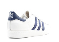 The Superstar 80s Vintage Deluxe re-emerges from adidas' archive with a simple two-tone look. The shoe's Vintage White premium leather upper is accented by Collegiate Navy on the Three-Stripes, heel patch and tongue tag, with perforations between the stripes for breathability. The shelltoe and classic trefoil branding complete the retro-inspired look. SKU: B25964 Colorway: Vintage White / Collegiate Navy / Off White Release Date: 1/10/15