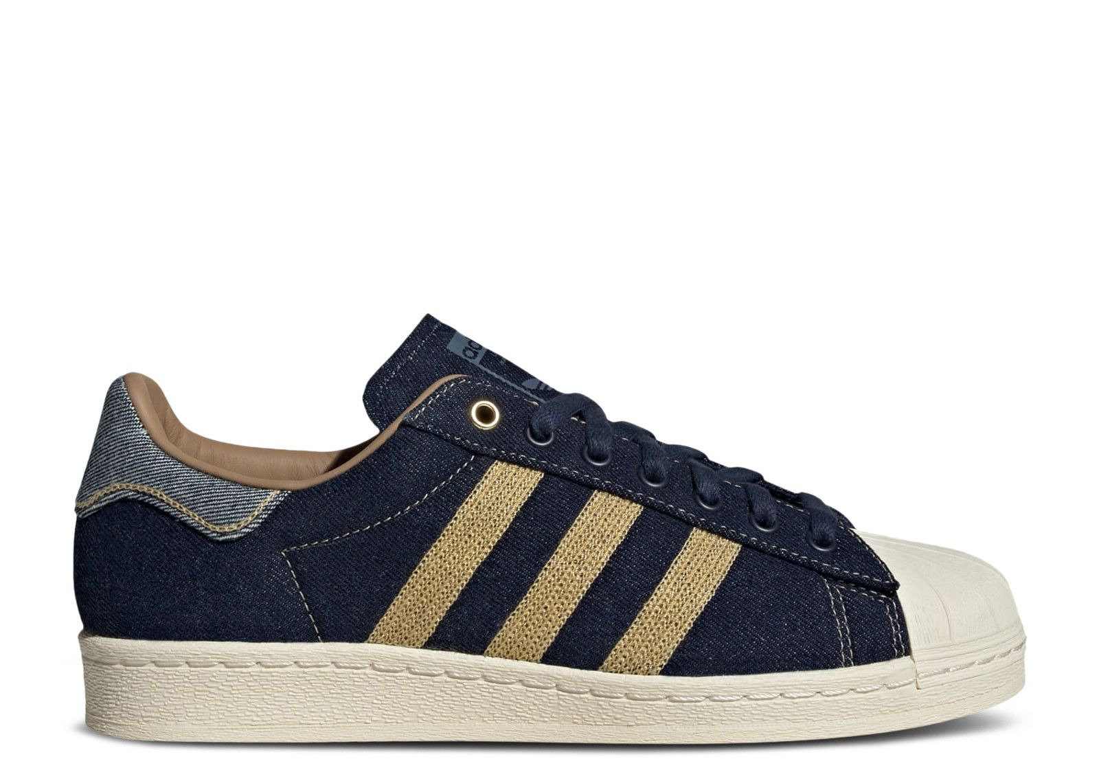 The adidas Superstar 82 'Denim' rocks a dark wash denim upper with a reinforced rubber shell toe, accented with gold-threaded three-stripes. Chain-stitch details decorate the denim back tab. A cream-colored rubber cupsole gets stitched sidewalls and a herringbone-patterned outsole. SKU: JH5577 Colorway: Supplier Color/Oat/Cream White Release Date: 1/9/25