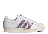 The classic construction of the Superstar emerges with unique accents on the Superstar 'Gaming Pack.' Built with leather, the shoe's upper appears in white, highlighted by pixelated detailing on the Three-Stripes, modeled after 8-bit video games. Off-white contrasts the inner lining and rubber shelltoe, which leads into a rubber cupsole that incorporates a herringbone outsole for traction. SKU: H05143 Colorway: Cloud White/Chalk White/Crew Navy Release Date: 1/7/21