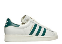 The Superstar 'Off White Collegiate Green' brings a retro-style two-tone look to the classic sneaker. The shoe's upper is built with an off-white leather base, highlighted by Collegiate Green on the heel patch and Three-Stripes. The Superstar branding accents the look in gold, while a leather inner lining and cork insole support the fit. Underfoot, the rubber cupsole incorporates a herringbone pattern on the outsole for traction. SKU: H68186 Colorway: Off White/Collegiate Green/Off White Release Date: 2/16/21