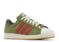 Celebrating the 40th anniversary of the franchise, the Teenage Mutant Ninja Turtles x adidas Superstar 'Shelltoe' shoes roll out a green tumbled leather upper with red three-stripes to accent the look. A gold foil 'Shelltoe' lettering gives them a signature vibe, while a white rubber toe showcases a turtle-shell design that nods to the ninja turtles. Custom sockliners with a pizza graphic and lace jewels that take after Raphael's signature red mask round out the look in style. SKU: IF9280 Colorway: Craft Green/Pantone/Shadow Green Release Date: 3/22/24
