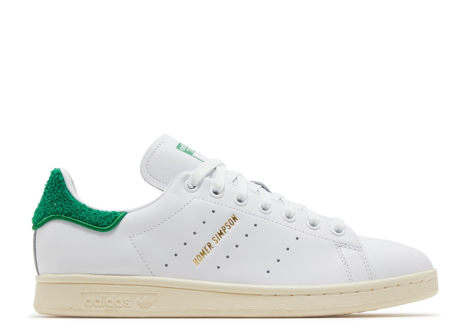 Celebrating the legendary animated TV dad meme, The Simpsons x adidas Stan Smith 'Homer Simpson' features a white leather upper with his name in gold-foil lettering and a printed Stan Smith tag featuring his likeness on the tongue. The robust rubber cupsole in a charming antique cream hue supports the sneaker.. The eye-catching heel tab showcases a snapshot of the famous GIF of Homer walking backward into abundant green hedges. SKU: IE7564 Colorway: Cloud White/Green/Cream White Release Date: 8/18/23