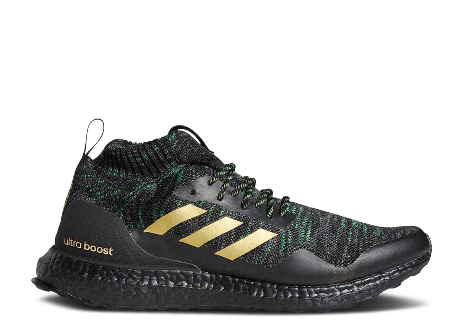 A PE colorway for the Super Bowl MVP, the Von MIller x UltraBoost Mid 'DeSoto High School' gives the nod to his high school alma mater. Built with Primeknit, the shoe's upper appears in a mix of black, grey and green, highlighted by metallic gold Three-Stripes on the side wall. An external heel counter is included for stability, with a heel pull-loop providing easy on and off. Underfoot, a full-length Boost midsole gives way to a Continental rubber outsole for cushioning and traction. SKU: FZ5490 Release Date: 12/9/20