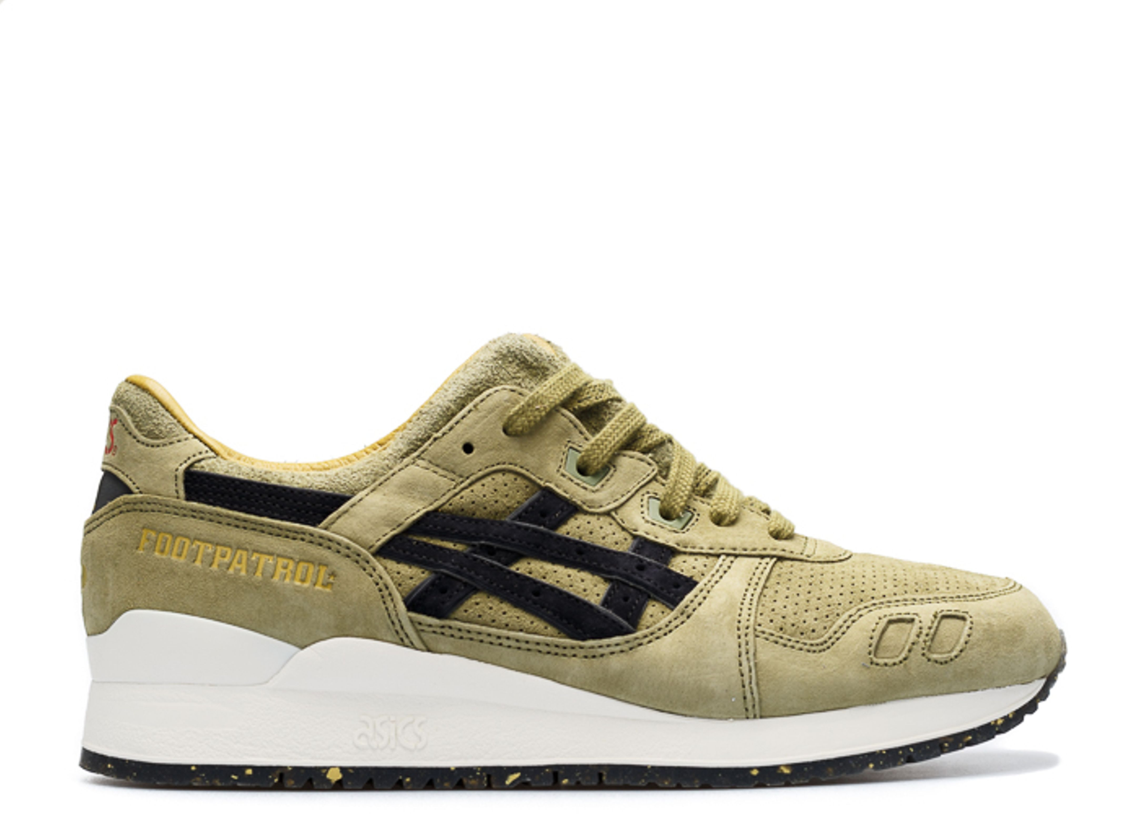 The Footpatrol x Gel Lyte 3 ‘Squad’ dropped in 2015, marking the 25th anniversary of ASICS’ popular silhouette. The collaboration takes inspiration from Footpatrol’s original gas mask logo, highlighted by an Olive Branch pig skin suede upper with perforated detailing on the toe box and quarter panels. Black suede tiger stripes appear on the lateral side, while tonal stripes adorn the opposite side. SKU: H51RK 8686 Colorway: Olive/Olive Release Date: 8/29/15