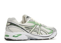The ASICS GT 2160 'Cream Bamboo' dons a breathable white mesh upper with green and metallic silver synthetic leather overlays. A lightweight foam midsole includes green GEL inserts on the heel for impact protection. A rubber outsole showcases ASICS' TRUSSTIC support system, consisting of a shank plate to promote midfoot stability. SKU: 1203A320 102 Colorway: Cream/Bamboo Release Date: 4/5/24
