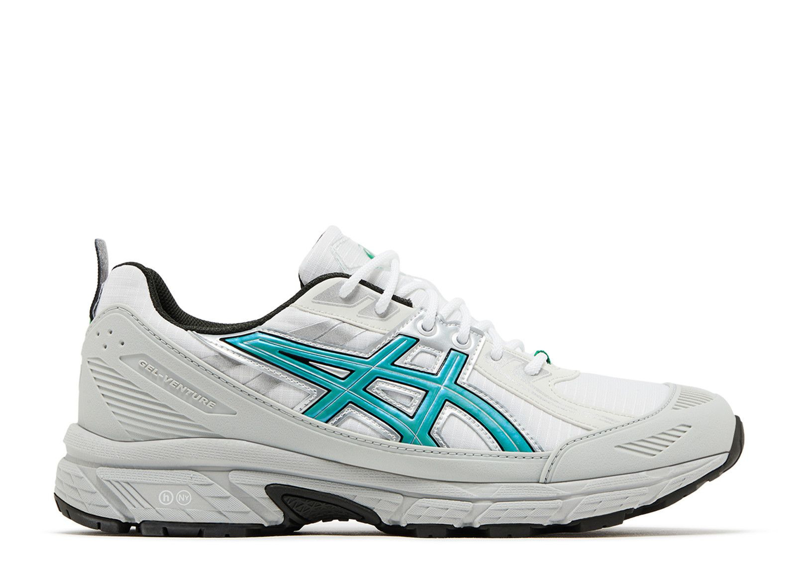 The Hidden NY x ASICS Gel Venture 6 Shield 'White Wasabi' uses a grey wrap to reinforce the white ripstop upper. Teal tiger stripes are outlined in metallic silver trim, while the tongue tags take turns sporting the Hidden NY and ASICS logo. These shoes have a lightweight foam midsole with GEL heel cushioning. A lugged rubber outsole keeps you surefooted in rugged terrain. SKU: 1203A778 100 Colorway: White/Wasabi Release Date: 12/20/24