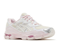 The Kicki Yang Zhang x ASICS Gel NYC 'Cream Pink' has an off-white mesh upper with white and pink patent leather overlays. Metallic silver tiger stripes match the toe cap for an eye-catching look. The. ASICS logo is embossed on the heel, while the insoles feature Kicki Yang Zhang's face. A pink foam midsole packs an exposed GEL unit in the forefoot and heel for all-around cushioning. SKU: 1203A571 100 Colorway: Cream/Pink/Pure Silver Release Date: 9/26/24