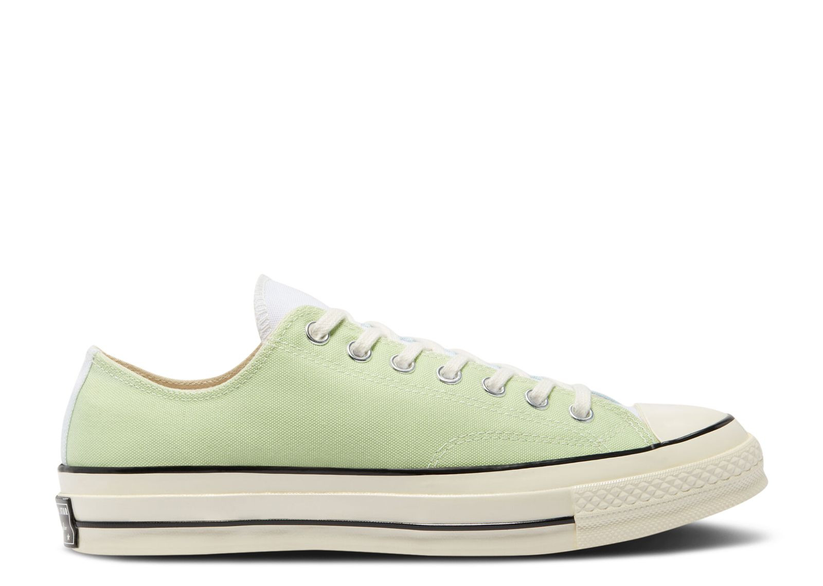 The Chuck 70 Low 'Tri-Panel' features a color-blocked look on its classic design. Built with canvas, the shoe's upper appears in Spring Green on the lateral side, complemented by Chambray Blue on the medial, with white on the tongue and heel strip. The vibrant look is contrasted by the off-white toe cap that leads into a rubber midsole underfoot, with black pinstripe detailing maintaining the signature aesthetic. The outsole incorporates a diamond pattern for traction. SKU: 170959C Colorway: Chambray Blue/Spring Green Release Date: 4/10/21