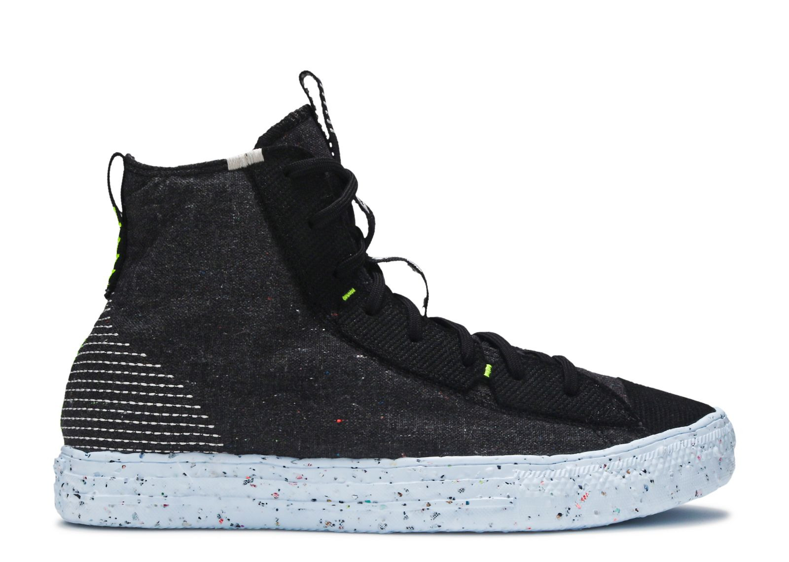 The Chuck Taylor All Star Crater High 'Black' brings a sustainable construction to its classic design. Built with recycled polyester and waste scraps, the upper appears in black, with a stylized finish on the heel and vibrant accents on the eyestay. Underfoot, the Crater Foam midsole is built in part with Nike Grind rubber, with a similarly recycled build on the mesh lining and OrthoLite sockliner. SKU: 168600C Colorway: Black/Chambray Blue/Black Release Date: 1/27/21