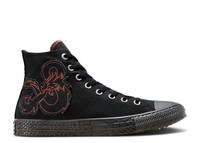 The Dungeons & Dragons x Converse Chuck Taylor All Star High 'Dragon Scales' nods to the tabletop role-playing game's 50th anniversary. Using black 12 oz. canvas on the upper, these shoes have a raw-edge heel stay and a matching rubber toe cap. A red D&D dragon graphic is carefully stitched on one side. A black rubber midsole gets an embossed dragon-scale print on the sidewalls for a textured look. SKU: A09886C Colorway: Black/Red/White Release Date: 4/11/24