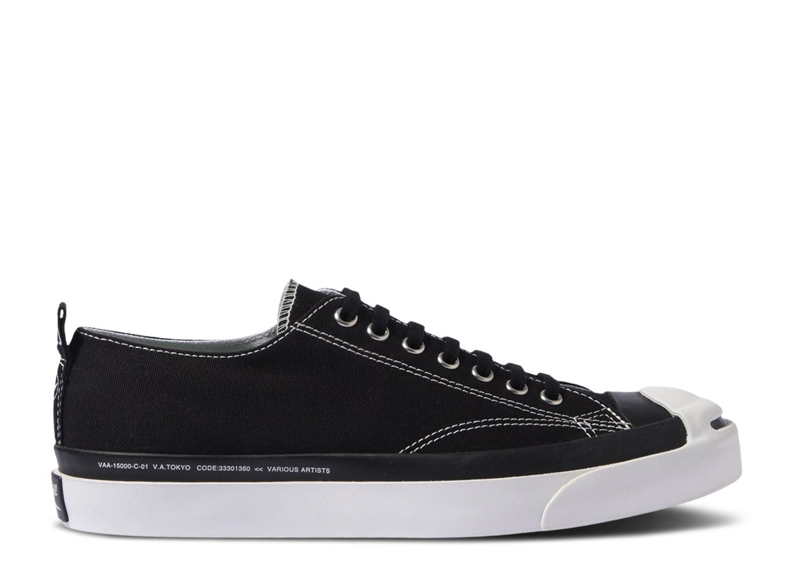 Originally made for a Canadian badminton champion, the Fragment Design x Various Artists x Converse Jack Purcell 1935 Low 'Black' has a black canvas upper adorned with white contrast stitching, chrome eyelets, and a rubber toe cap. All three brand logos are present on the mint green insoles, while VA and Fragment emblems decorate the heel pull tab. A black foxing tape lands on the white rubber midsole, stamped with a Jack Purcell license plate. SKU: 00004 10000FDXVAX BLAC Colorway: Black Release Date: 6/28/25