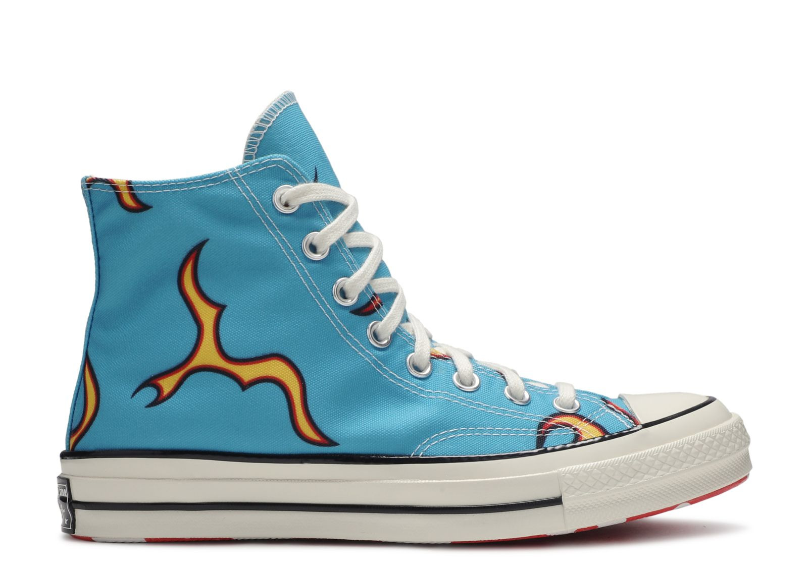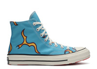 The Golf Le Fleur x Converse Chuck 70 'Flame' features a graphic print on the high-top’s blue canvas upper that draws inspiration from ‘Cherry Bomb,’ Tyler, the Creator's third studio album. Details include chrome eyelets, a traditional All Star patch on the medial collar and a white rubber midsole with black pinstripes. A white-on-red floral print covers the sneaker’s rubber outsole. SKU: 167279C Colorway: blue Release Date: 10/12/19