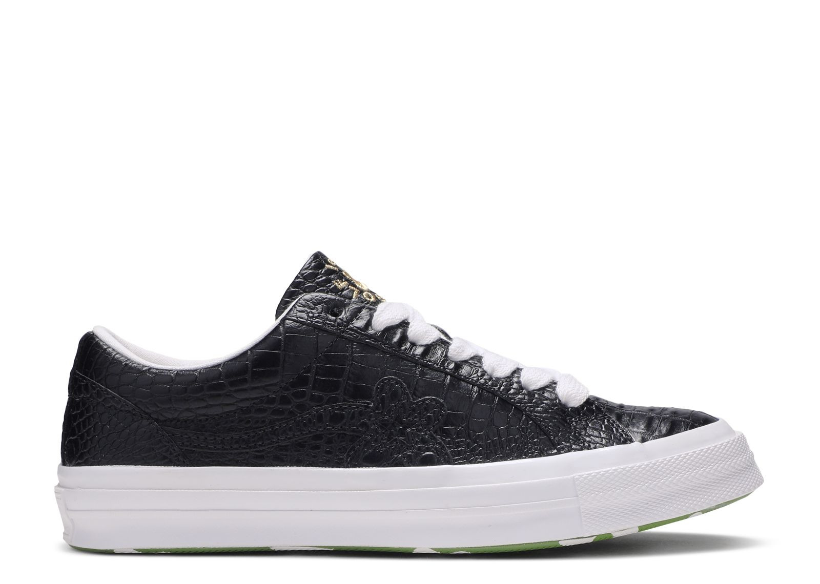 The Golf Le Fleur x One Star Low 'Gator Collection - Black' released as part of a three-shoe pack from Tyler, the Creator and Converse. The shoe's black upper is finished with a faux crocodile texture throughout, accented by gold Golf Le Fleur branding on the tongue. Contrasted by white on the laces and lining, a tonal flower logo is worked into the quarter panel. A white vulcanized midsole gives way to an outsole with a floral pattern. The shoe is individually numbered out of 1,000. SKU: 165524C Colorway: Black/Black/White Release Date: 4/6/19