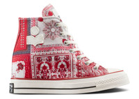 The Isabel Marant x Converse Women's Chuck 70 Wedge Platform High 'Red Bandana Scarf' rocks a bandana print engulfing the off-white canvas upper, hiding the 2.5-inch wedge attached to the stacked rubber midsole. Isabel Marant's logo decorates the ankle area, while the All Star patch adorns the opposite side. The red bandana print appears yet again below the rubber outsole. SKU: A14802C Colorway: Vanilla Ice/Red/Black Release Date: 6/5/25