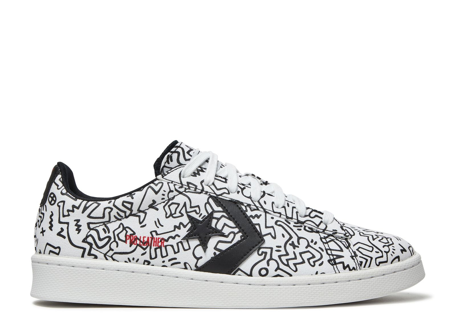 Paying tribute to the legacy of the pop art icon, the Keith Haring x Pro Leather Low released as part of a larger capsule collection. Built with a white leather base, the shoe's upper is highlighted by a series of graffiti-style designs made up of his expressive figures. The heel patch adds Keith Haring's signature in red, while underfoot, a white rubber cupsole anchors the build, offering traction via a brick pattern on the outsole. SKU: 171857C Colorway: White/Black/Red Release Date: 5/13/21