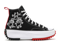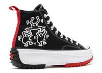 The Keith Haring x Run Star Hike released as part of a larger collection celebrating the 80s pop artist. As a result, the shoe's black canvas upper is highlighted by Keith Haring's graffiti-style designs on the lateral side. The medial side instead sports a classic All Star ankle patch, and a red heel pull-loop offers color and easy on and off. The tongue and sockliner sport Haring's signature, while underfoot, the platform midsole gives way to a sawtooth rubber outsole for traction. SKU: 171859C Colorway: Black/White/Red Release Date: 5/13/21