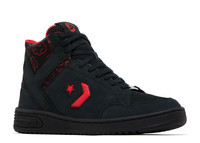 The Naruto Shippuden x Converse Weapon Mid 'Itachi' rolls out a black nubuck upper with a red Star Chevron emblem. A red graphic print on the black jacquard collar reflects the pattern seen on Itachi's cloak. Both brand logos are present on the insoles, while the other has an Itachi graphic. A black rubber cupsole completes this anime-inspired look. SKU: A14835C Colorway: Black/Red Release Date: 5/22/25