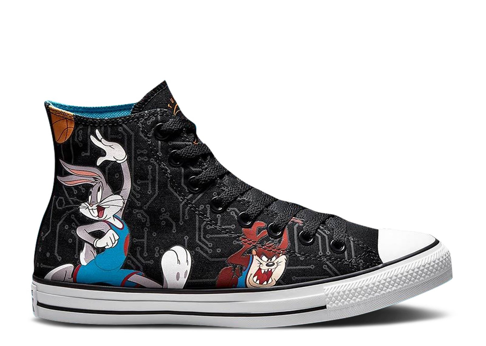 The Space Jam x Chuck Taylor All Star High 'Tune Squad ' dropped in July 2021 to celebrate Space Jam: A New Legacy. Built with canvas, the shoe's upper appears in black, sporting computer chip-inspired lines throughout the construction. Members of the Tune Squad, ranging from Bugs Bunny to Daffy Duck to Marvin the Martian, highlight the design, while the tongue adds Tune Squad branding. A classic white rubber outsole anchors the fit underfoot. SKU: 172485C Colorway: Black/Multi/White Release Date: 7/16/21