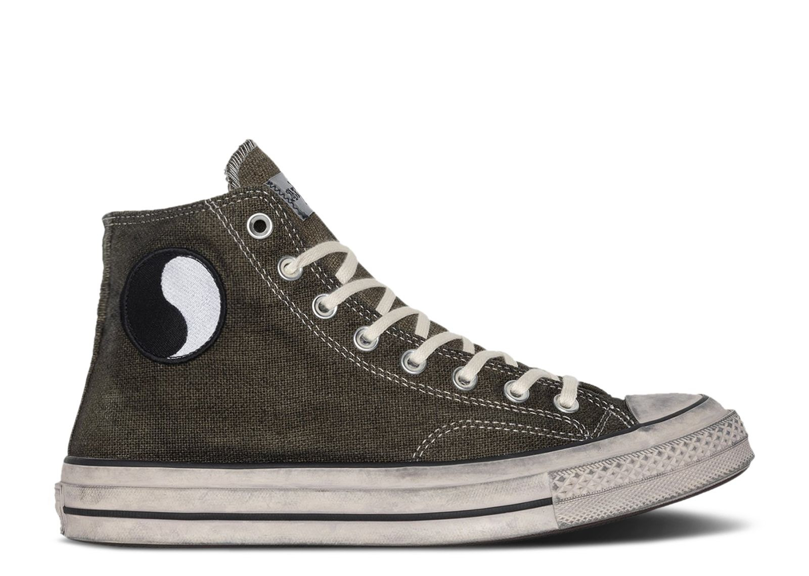 Part of a three-piece footwear collection, the Stussy x Our Legacy x Converse Chuck 70 High 'Pigeon Grey' introduces the iconic high-top in a washed and vintage-inspired style. The pre-distressed white rubber midsole is accentuated with black pinstripe detailing. The hemp upper showcases a dark grey hue, achieved through an overdyed process in Portugal using eco-friendly dyes in a closed water loop cycle. On the lateral ankle is Our Legacy's embroidered Work Shop patch, while the medial ankle has a hidden All Star patch. SKU: A06849C PIGEON Colorway: Pigeon Grey Release Date: 6/30/23