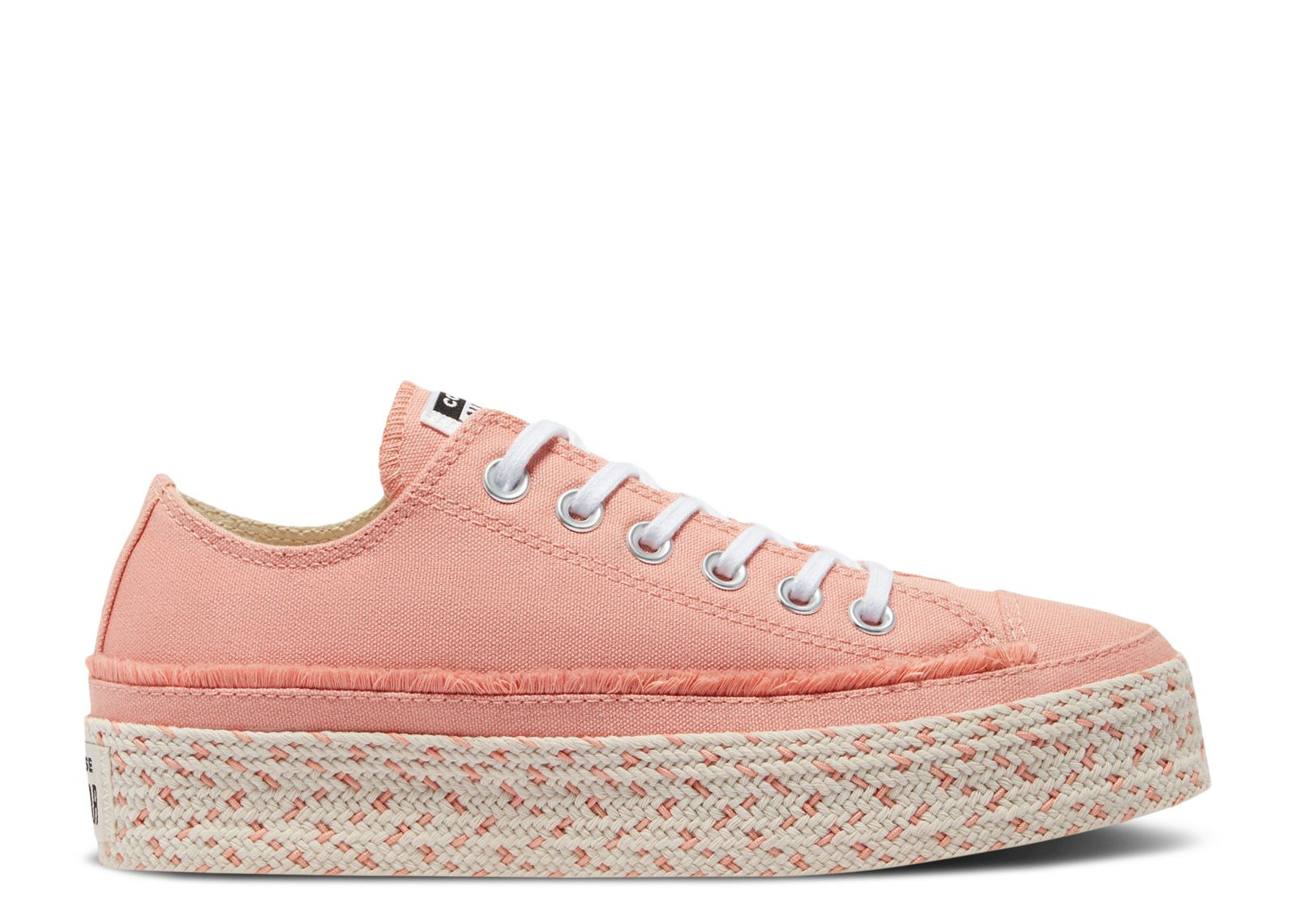 The Wmns Chuck Taylor All Star Low 'Color Espadrille - Pink Quartz' reimagines the iconic silhouette as an espadrille. Built with canvas, the shoe's upper sports a Pink Quartz finish, accented by frayed detailing around the base of the design. Chrome eyelets secure the fit, while underfoot, an elevated rubber midsole with braided textile overlaying the design anchors the look. A diamond rubber outsole is included for traction. SKU: 570771C Colorway: Pink Quartz/White Release Date: 4/8/21