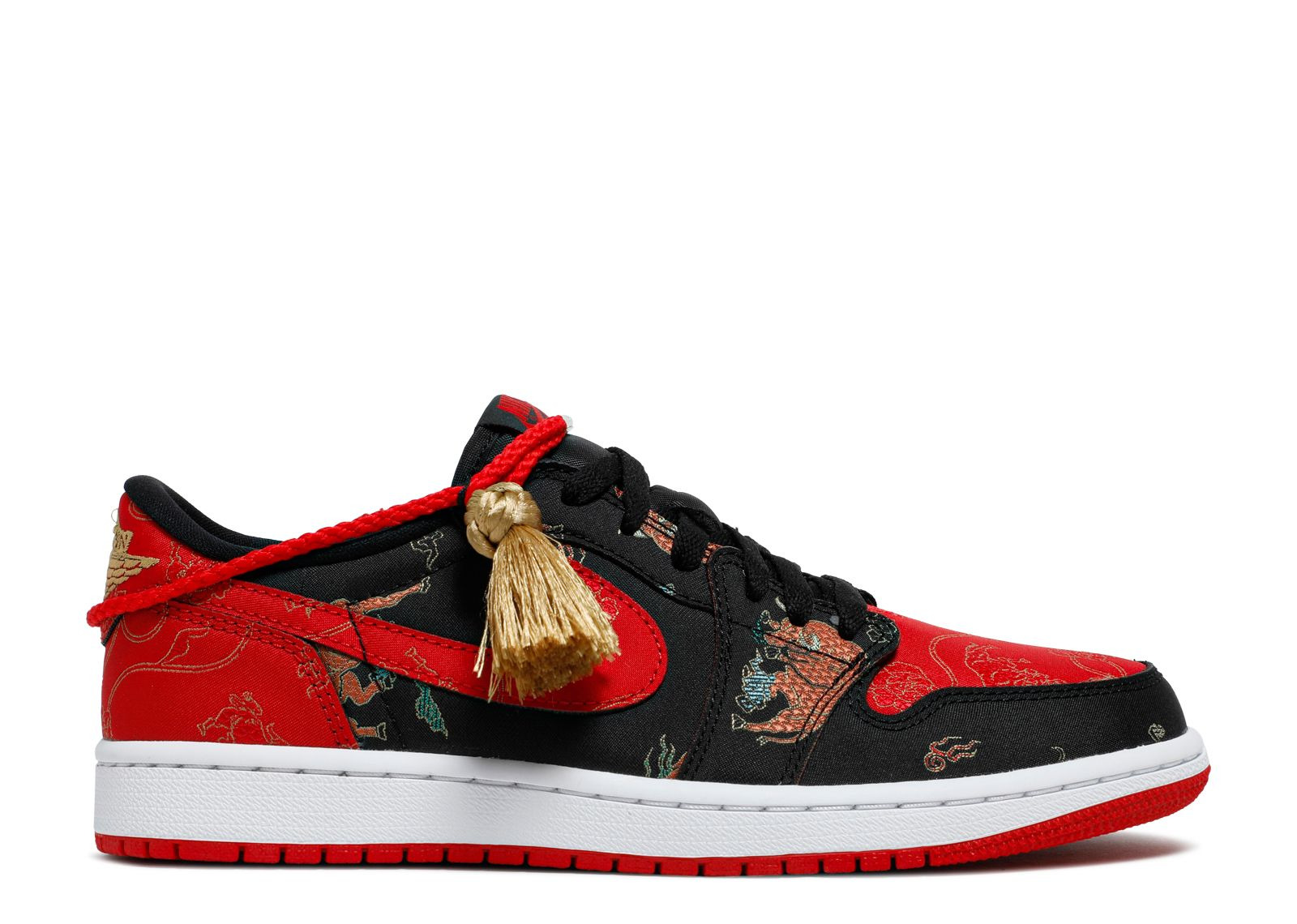 Releasing to celebrate the Year of the Ox, the Air Jordan 1 Retro Low OG 'Chinese New Year' was limited to 8,500 pairs. The shoe emerges with a textile construction in a classic mix of black and red, highlighted by a jacquard print throughout. Various graphics directly call out the Year of the Ox, while the heel adds an elevated touch via a gold 'Wings' logo. The shoe released in packaging that included a tasseled rope bracelet and a red envelope containing a collectible card. SKU: DD2233 001 Release Date: 1/31/21