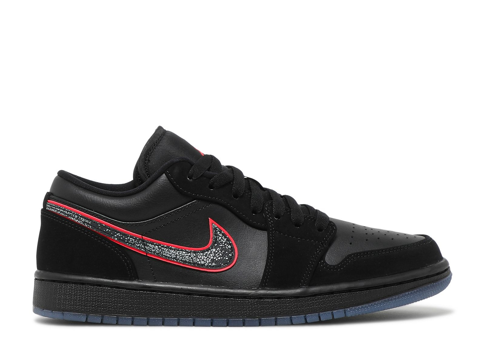 The Air Jordan 1 Low 'Red Orbit' features vibrant accents on its signature tooling. The shoe's upper is built with leather, finished in black and overlaid by nubuck. The Swoosh outline highlights the look in Red Orbit, with a cracked effect on the Swoosh itself. The nylon tongue adds further red via the Jumpman branding, while underfoot, a black Air midsole provides cushioning. SKU: CK3022 006 Colorway: Black/Black/Red Orbit Release Date: 7/24/20