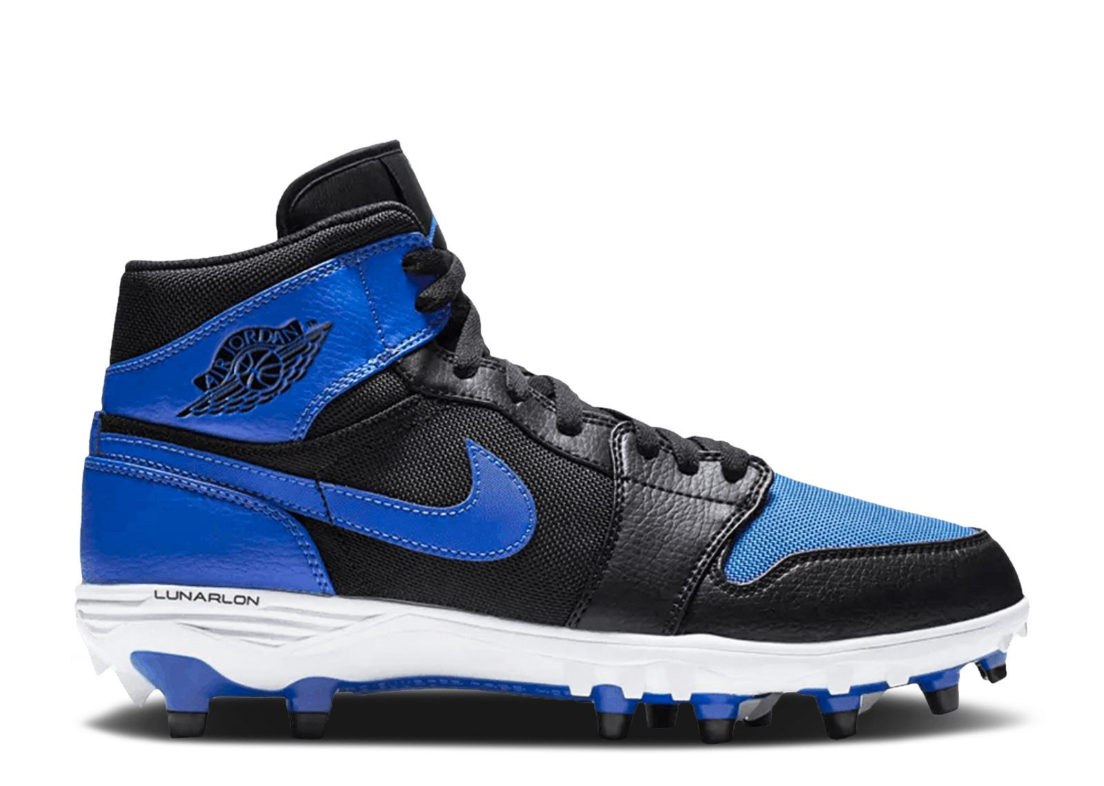 The 'Royal' was Michael Jordan's personal favorite OG Air Jordan 1 colorway, and the Jordan 1 Mid TD 'Royal' brings that iconic look to the football field. Repurposed as a cleat, the mid-top shoe is built with a mix of synthetic and textile, finished in black and Royal. The usual branding hits remain intact, including a 'Wings' logo on the collar, while underfoot, a contrasting white Lunarlon midsole provides cushioning. Rubber studs on the outsole in black and Royal provide traction. SKU: AR5604 041 Colorway: Black/Royal-White-Royal Release Date: 3/24/19