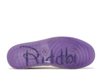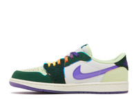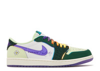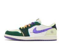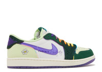 Riddhi Mahajan's Air Jordan 1 Retro Low OG is a part of Nike's Doernbecher Freestyle XVIII collection of six different shoe styles. Riddhi's low-top design reflects her optimistic outlook on life through its extravagant hues. The leather upper is secured with ombre laces, reminiscent of a sunrise, with lush green overlays, a violet Swoosh, and white quarter panels. On the translucent purple rubber outsole, Riddhi's name and a daisy graphic are visible. The phrase 'Radiate Positivity' is printed on the lateral midfoot, while the fluorescent green toe box displays the words 'Brand New Day.' SKU: FD9665 351 Colorway: Gorge Green/Court Purple/White/Barely Volt/Sail Release Date: 2/25/23